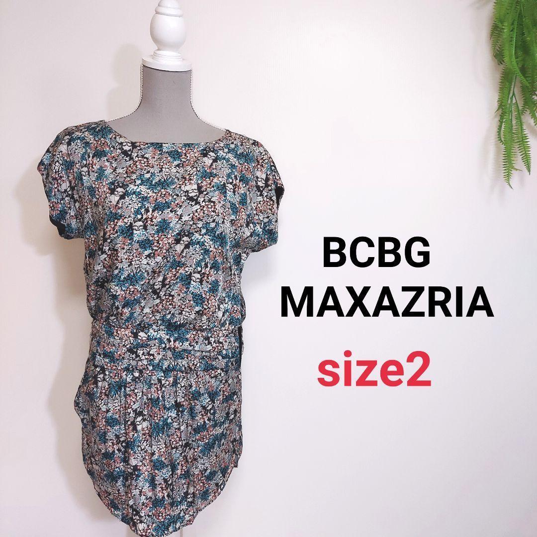 - BCBG ENERATION 猫&ボタニカル柄・ヨーロピアン総柄 半袖トップス 表記サイズ2 S.Mサイズ相当 青緑ブルーグリーン&黒&くすみピンク&白0153