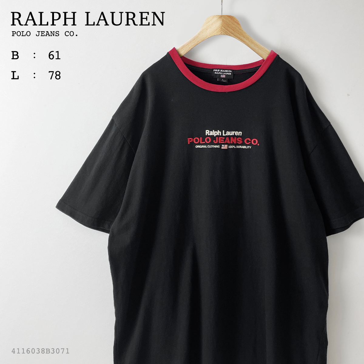 > RALPH LAUREN メンズ XXL 2XL 相当 ポロジーンズ 半袖 ボックス ロゴ 刺繍 リンガー Tシャツ 黒 ブラック 赤 レッド 丸首 オーバーサイズ L