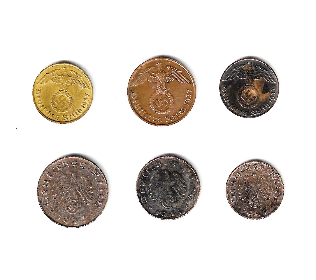 - ドイツ第三帝国 (鉤十字) - 1, 2, 5, 10 ライヒスペニヒ/青銅貨 黄銅貨 亜鉛貨 6枚★ZD-30