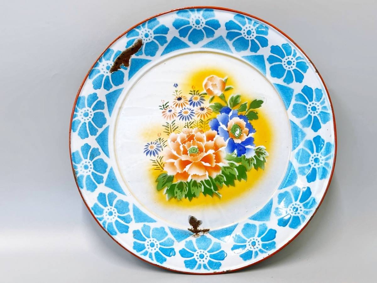 - レトロ SANRYU.E.W 大皿 ホーロー 特大 直径50㎝ 花柄 ホーロー大皿 飾り皿