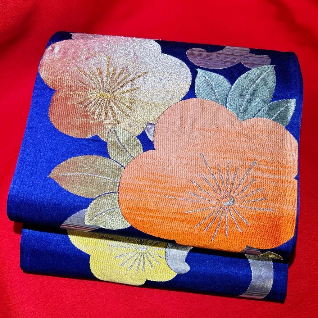 > ☆美品☆袋帯 椿 花柄 青系 六通 金銀糸 大柄 着物用 和服用 振袖 華やか 和装小物 (12145並
