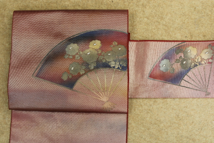 > きもの今昔6226 名古屋帯 西陣織八寸名古屋かがり仕立て エンジ色地に銀ぼかし箔 太鼓と前腹に扇に花柄