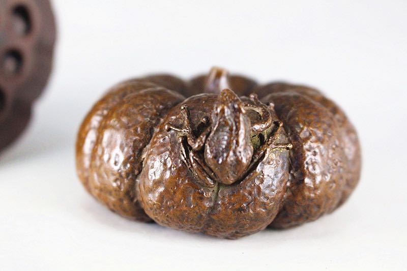 - 極美古銅 煎茶道具質感 実心 銅カエル+かぼちゃ置物 収= 収穫が豊かな季節 好運アップ 希望満載