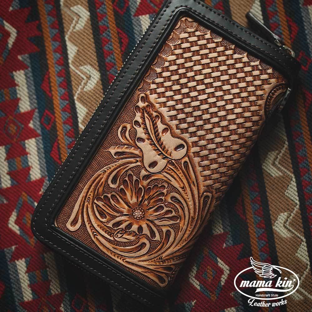 - 長財布 ラウンドファスナー メンズ・レディース ヌメ革 サドルレザー レザーカービングウォレット バイカーズウォレット rf009cv84br02