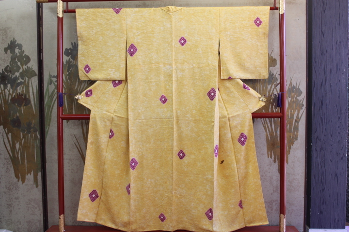 - きもの今昔6417 小紋のきもの 広衿袷手縫い仕立て すすき地紋ベージュ群雲ボカシに手絞り入り 身丈149cm
