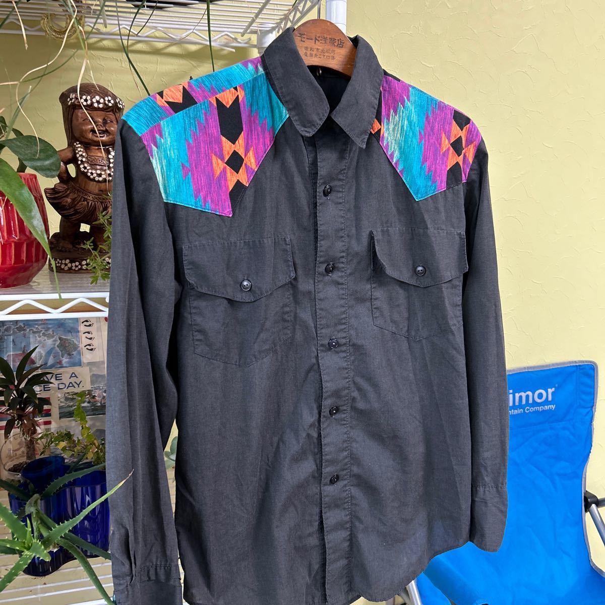 - USA ビンテージ ウエスタンシャツ 黒 民俗調 M