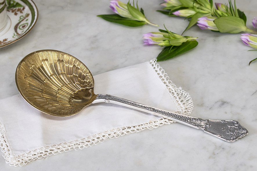 エレガントなハンドルの先についたボウル部分はシェル(貝)の形になっており、美しいヴェルメイユも非常に状態良く残っています。
