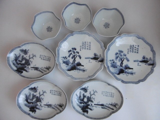 - 昭和レトロ/当時物 昔の食器 まとめて8客 刺身皿/小鉢/取り皿 山水図/山水画/風景画 染付 (有田焼?)