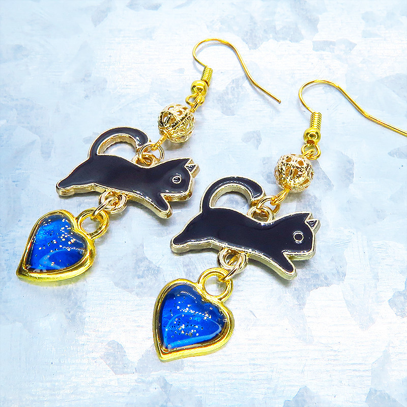 - 跳び黒猫とブルーハートの大人可愛いピアス エナメル ゴールドメタルビーズ マリンブルーレジン サージカル可