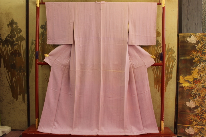 > きもの今昔6494 色無地きもの 広衿袷手縫い仕立て 正絹紋意匠生地 淡い藤色無地染 躾け付きですが 身丈159cm