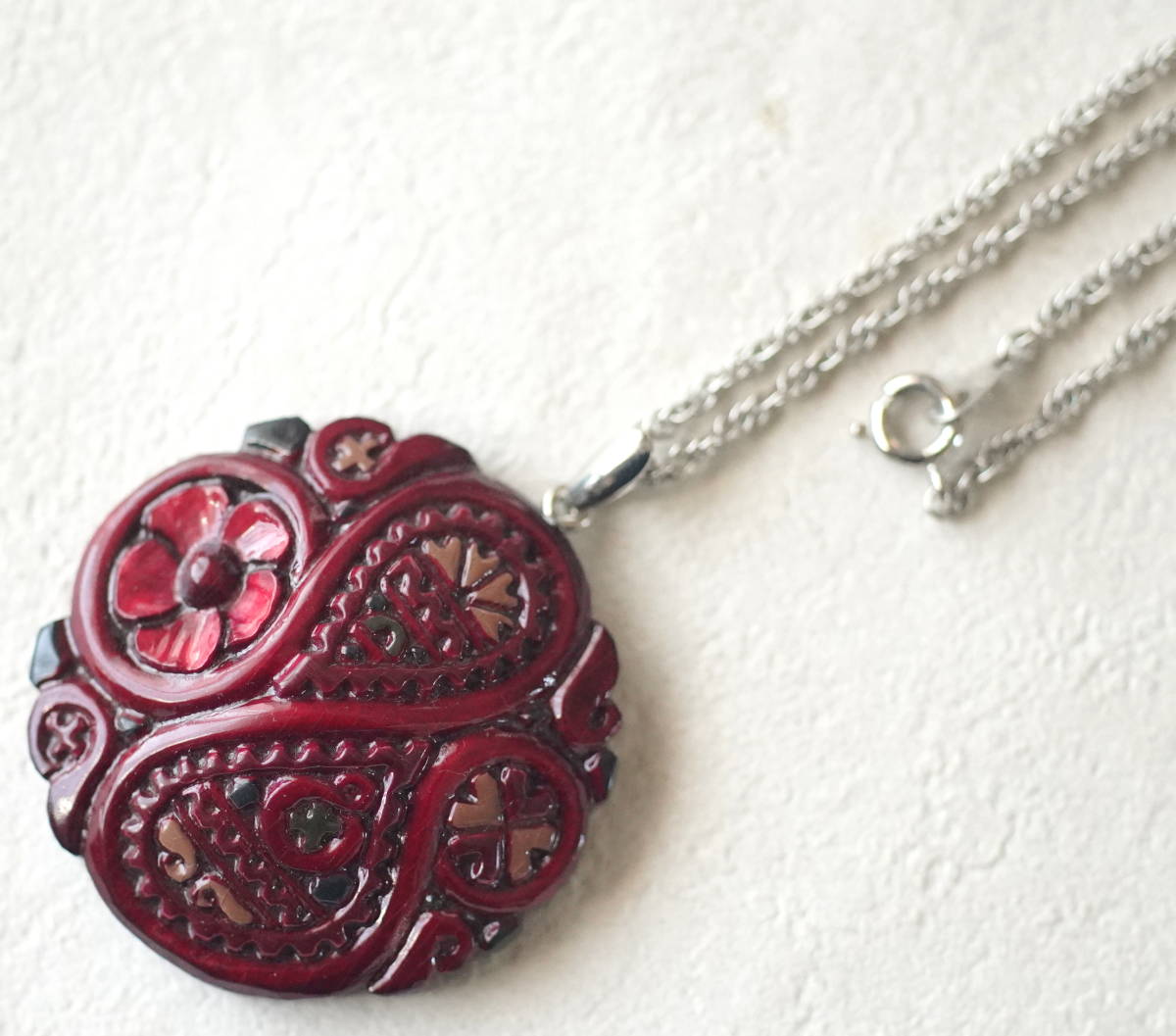 - アイヌ 民芸品 手彫り 木製 紋様のネックレス 魔除け お花 赤 紅