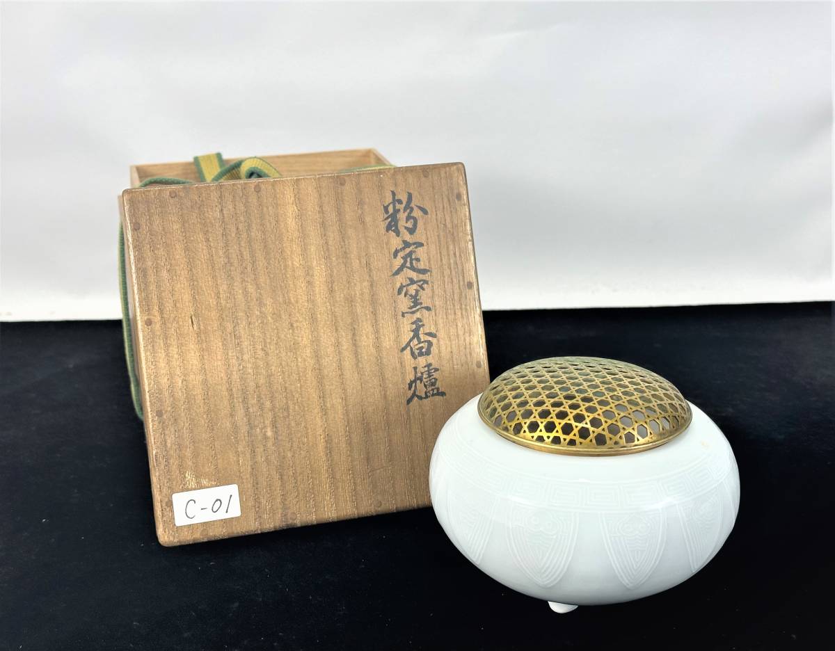 - E199●【粉定窯香炉】定窯 香炉 白磁 銅製籠透火舎 香炉灰 香道具 中国美術 陶器 共箱 総重:約369g 現状品
