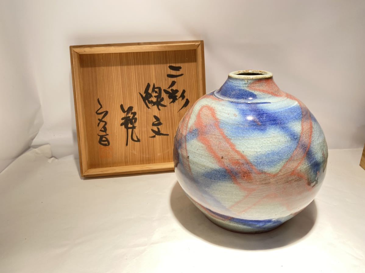 > G136●花瓶 二彩 色絵 花入 花生 花器 華道具 陶磁器 陶器 焼物 飾り物 骨董品 茶道具 陶芸 在銘 高さ:約25.5cm 重さ:約2602g