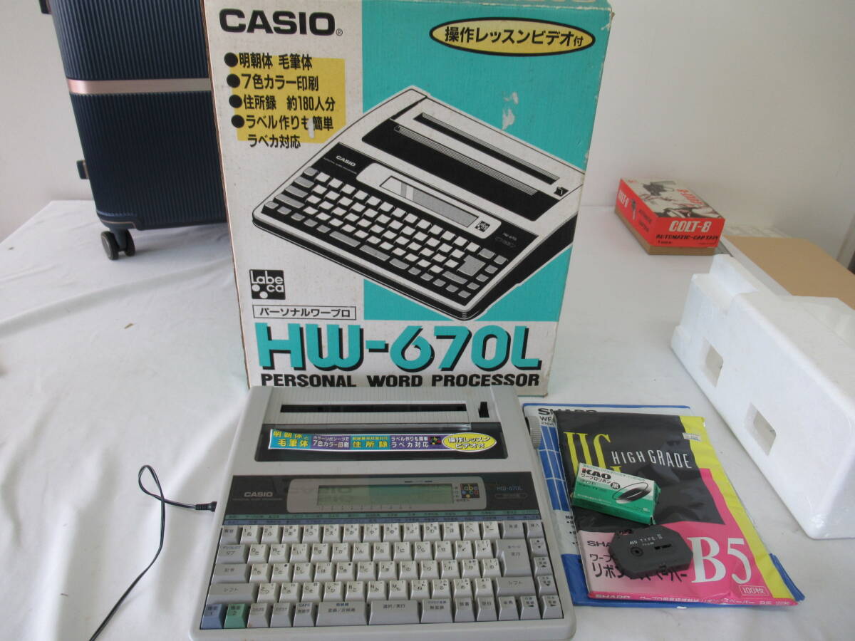 > H02027 CASIO カシオ HW-670L PERSONAL WORD PROCESSOR パーソナルワープロ 通電確認済み ジャンク? リボン・用紙付き