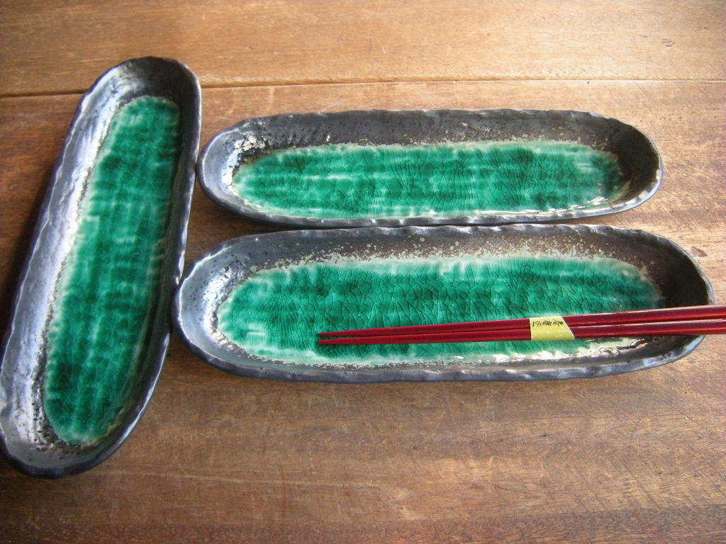 > 睦◎美濃焼【新品・未使用】貫入 深海グリーン 緑 トレー 長皿(30㎝x9.5㎝x3㎝)1枚から *お勧め*人気商品*