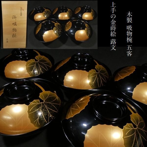 【 恵 #1022 】 上手の金蒔絵 蕗(ふき)文 木製 吸物椀 五客 共箱あり ② 検:懐石/茶道/茶道具拍卖