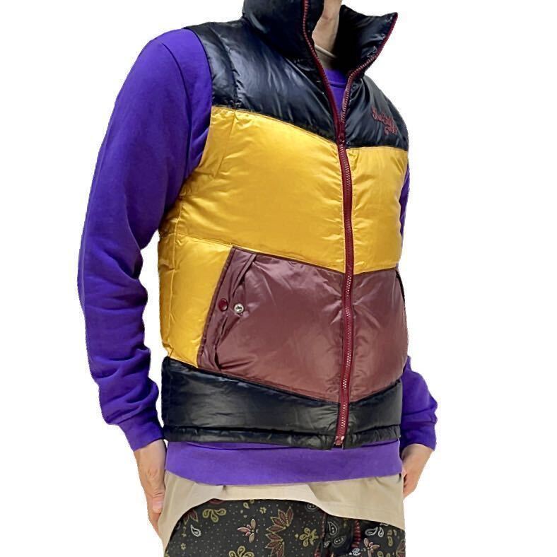 - 中古 STIFF スティッフ チェーンステッチ ロゴ ブラック イエロー パープル 黒 黄色 バーガンディ 3色 配色 コントラスト ダウンベスト S