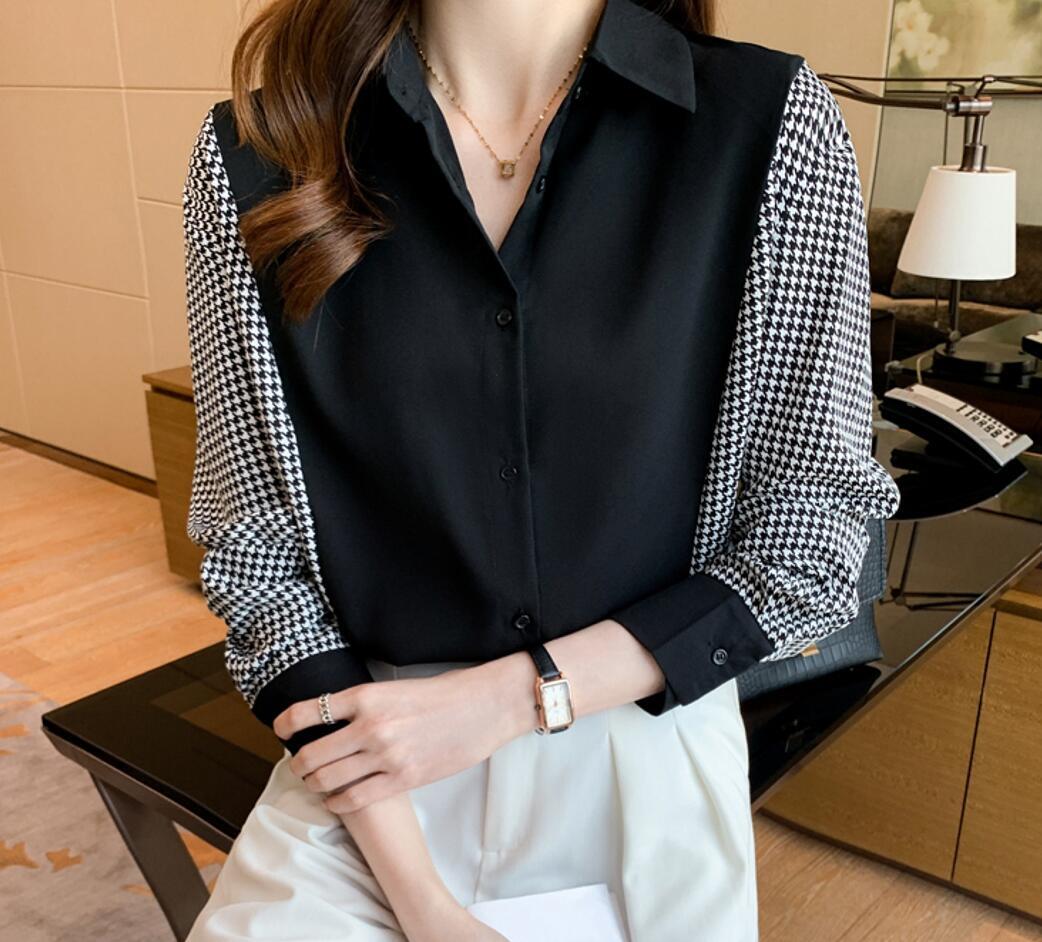 - 新入荷 / 優雅で 上品 ブラウス 千鳥格柄 切り替え 長袖ブラウス 着痩せ 大人 通勤OL ゆったりシャツ オシャレブラウス / XLサイズ以上