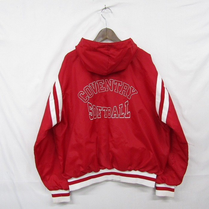 > USA製 サイズ XL 48 70s RENNOC ナイロン プルオーバー ジャケット スタジアム ジャンパー クラブ プリント 赤 古着 ビンテージ 3MA1522