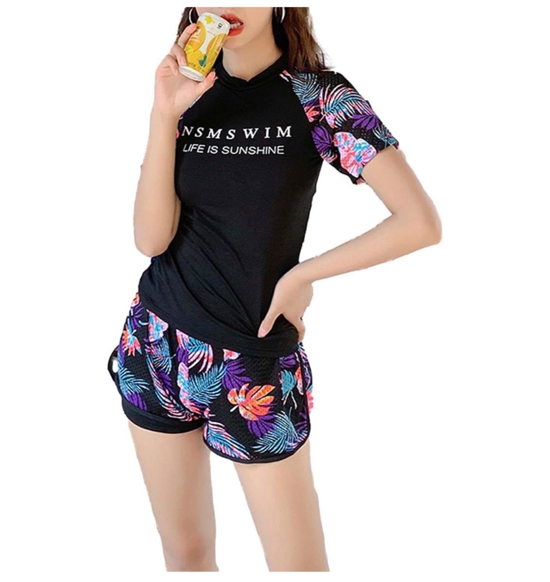 > ラッシュガード ボタニカル 柄 上下セット セパレート 水着 レディース タンキニ 半袖 ショートパンツ 水陸両用 黒 かわいいMサイズ