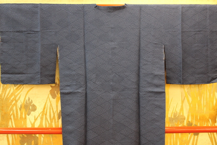 - きもの今昔6694 道行きコートコレクション 正絹紋意匠 菱格子地紋様 濃紺色無地 シツケ糸付未使用品 身丈83cm