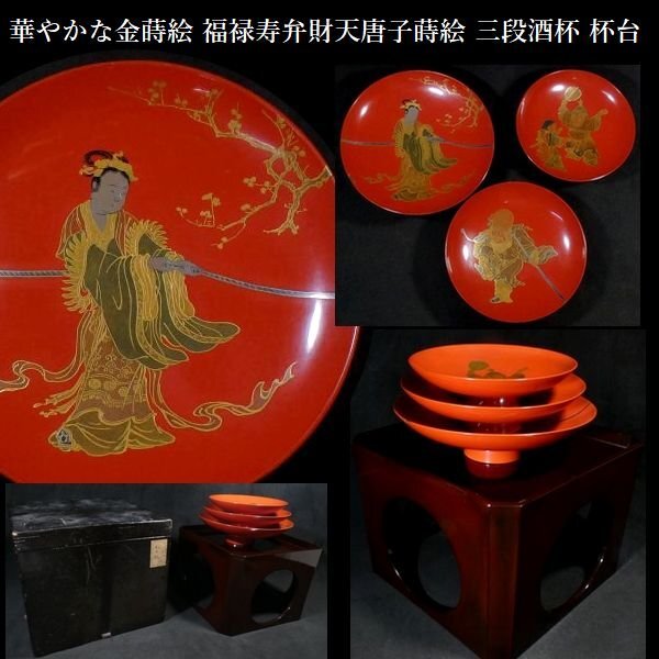 【 恵 #1074 】 完全初出し品 華やかな金蒔絵 福禄寿弁財天唐子蒔絵 三段酒杯 杯台 保管箱あり
