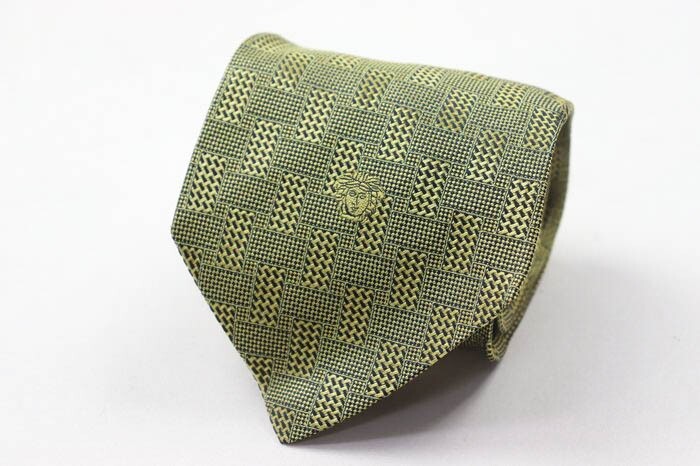 - ジャンニ・ヴェルサーチ シルク メデューサ柄 格子柄 パネル柄 ブランド ネクタイ メンズ イエロー 美品 GIANNI VERSACE