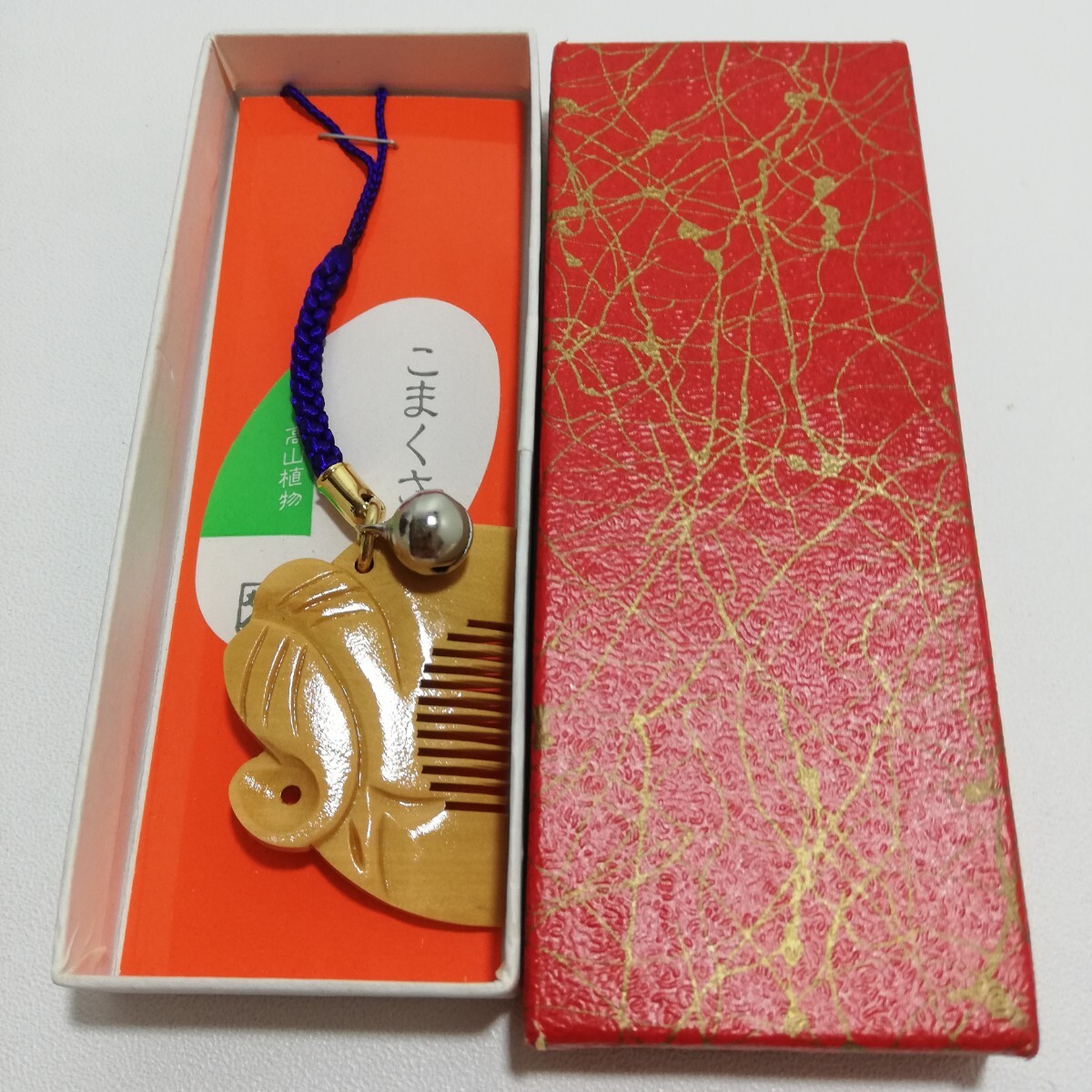 - 手彫り本つげ こまくさ 高山植物 櫛形 根付 ストラップ 箱付き 未使用品 [本柘植 柘植細工 彫刻 木工芸品 日本美術]