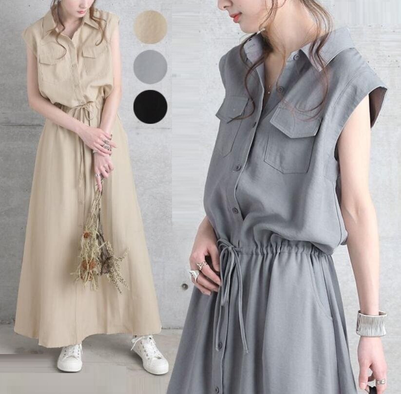 - LB181 ワンピース レディース ロングワンピース ノースリーブ シャツワンピース 袖なし お呼ばれワンピース 大きいサイズ カーキ