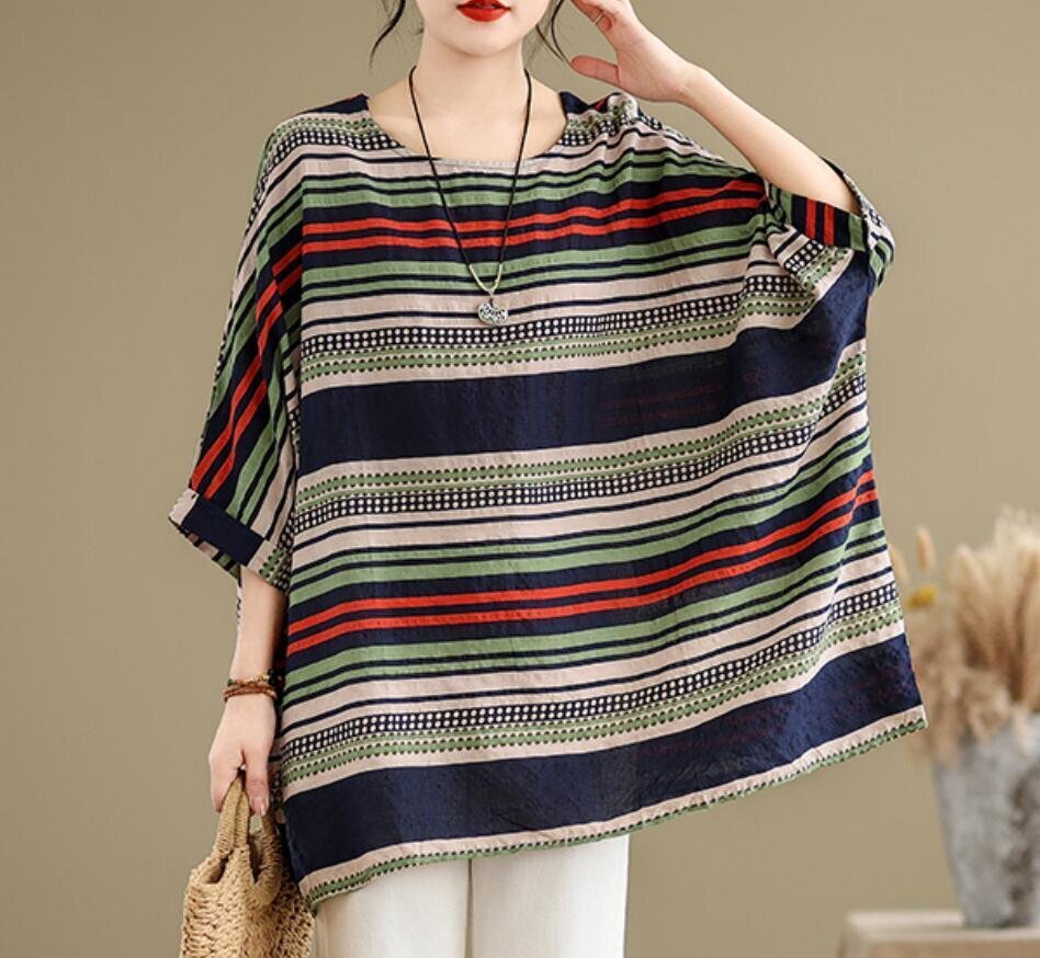 - LB059 チュニック 夏 ドルマン袖 ロング ブラウス レディース トップス ボーダー柄 大きいサイズ ゆったり 大人 可愛い カジュアル