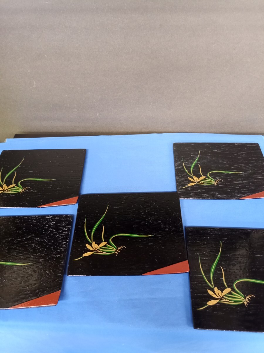- 昭和レトロ■木製漆器 花柄 銘々皿 五枚セット