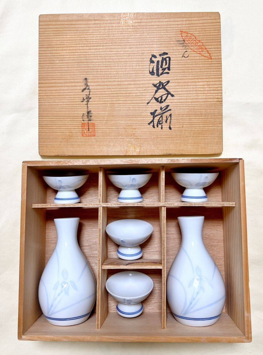 - 未使用 有田焼 永峰作 ラン蘭柄 徳利2本&高台盃5客 酒器セット
