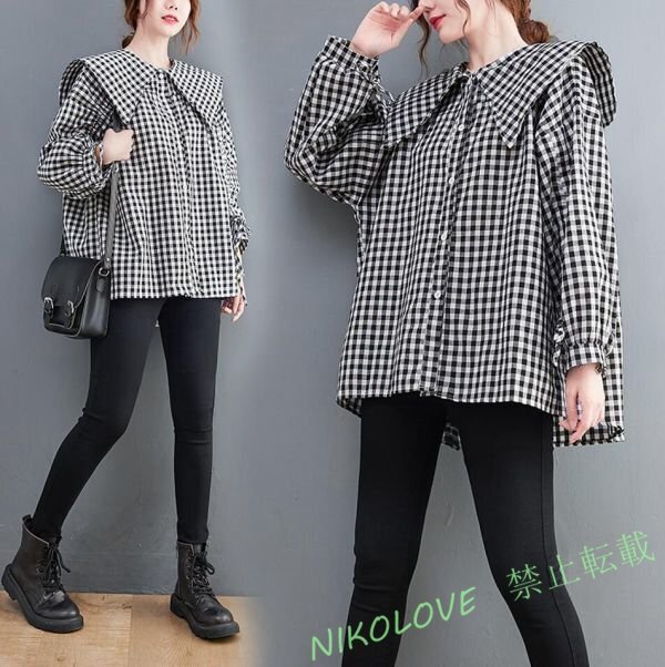 - LC112 超可愛い 大人 トップス チェック柄 綿麻 ブラウスシャツ 学院風 大きいサイズ 長袖 チュニック XLサイズ
