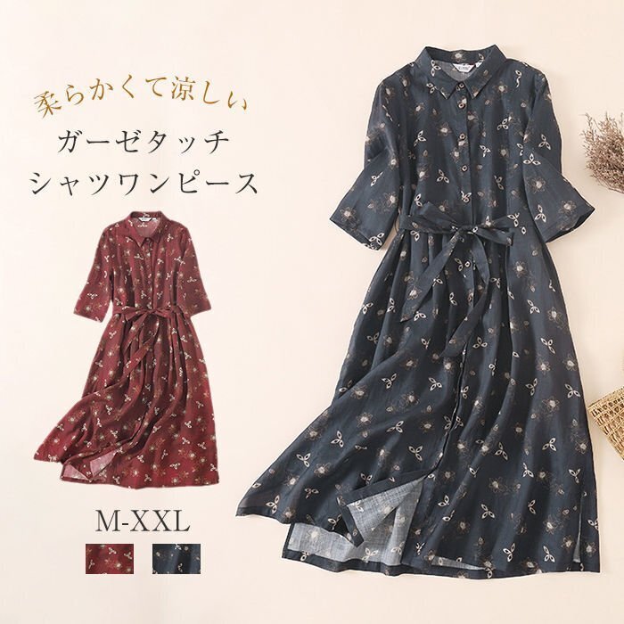 - LB890 ワンピース レディース シャツワンピース 小花柄 長袖 ブラウス Aライン 春 夏 ワンピース 着痩せ 多色選択可/M~3XLサイズ