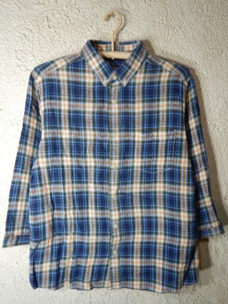 > n8898 Eddie Bauer エディー バウアー 7分袖 チェック デザイン ボタンダウン シャツ BDシャツ リネン 混紡 人気
