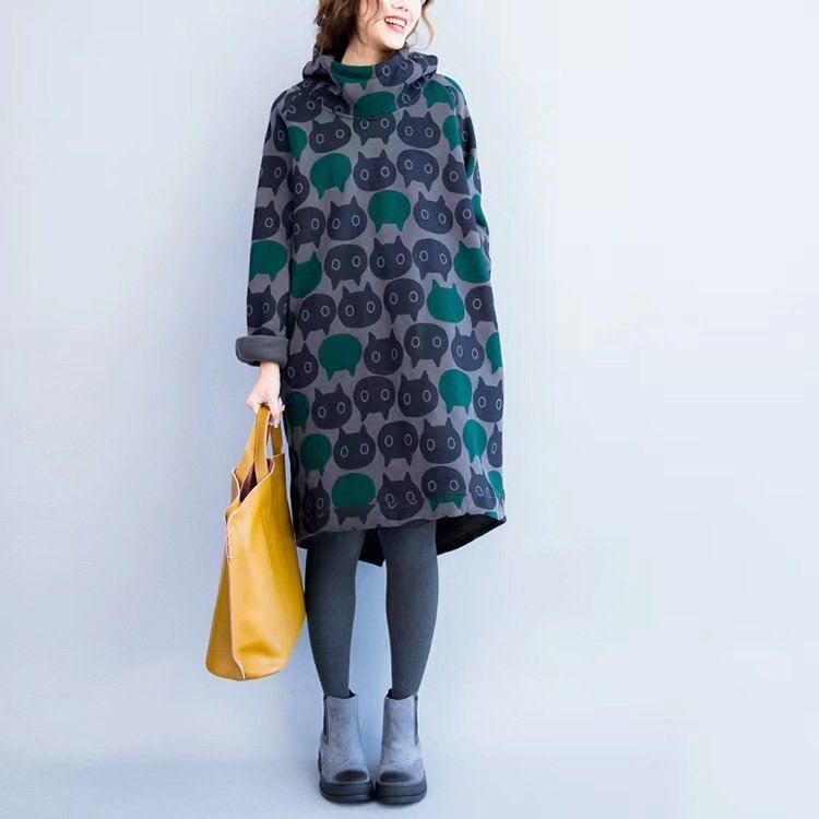 - LRM216★新品 フリーサイズ 秋冬 オシャレ フード付き 長袖 チュニックワンピース 厚地 暖かい 裏起毛 ゆったり 可愛い大人 大きいサイズ