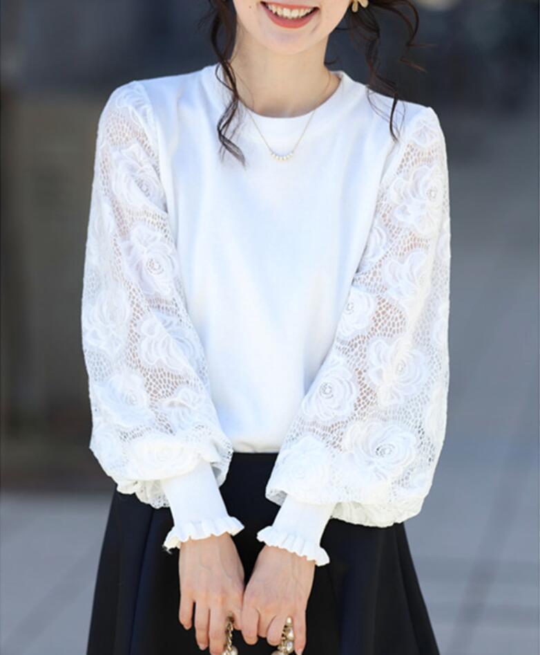 - 新入荷*ニット トップス カジュアル ニット 長袖 レース切り替え お花 可愛い 大人 レディースセーター 着やせ チュニック*白