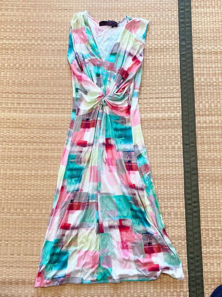 > 華やかノースリーブ ワンピース ひざ丈 スカート 総柄 ストレッチ 素材 幾何学模様 明るい色合い ブルー ピンク 黄色 ウエストシェイプ