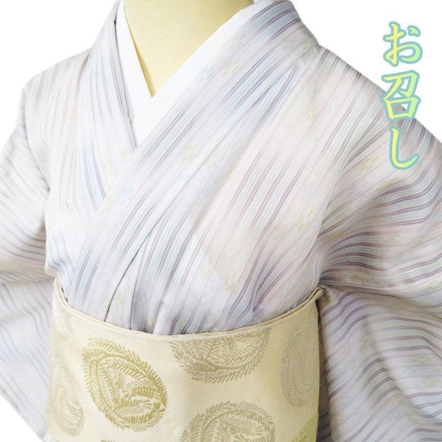 - 特選 夏物 お召し 御召 着物 中古 正絹 カジュアル 縞模様 オフホワイト 多色 身丈156cm 裄63cm M きもの北條 A1022-10