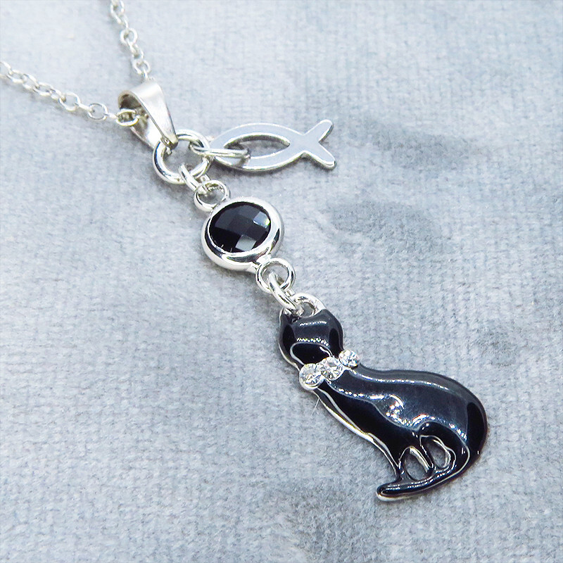 - ラインストーンのリボンのついた黒猫チャームにお魚を添えた大人可愛いネックレス ブラックラインストーン ステンレス可