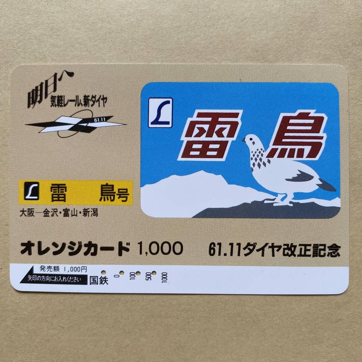 - 【使用済】 オレンジカード 国鉄 61.11ダイヤ改正記念 雷鳥号 大阪一金沢・富山・新潟