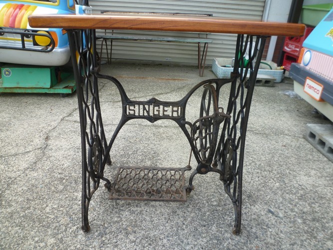 - 昭和レトロ アンティーク SINGER ミシン 鉄脚 網目 足踏み脚 鉄製 インテリア テーブル デスク 作業台 欅の1枚板