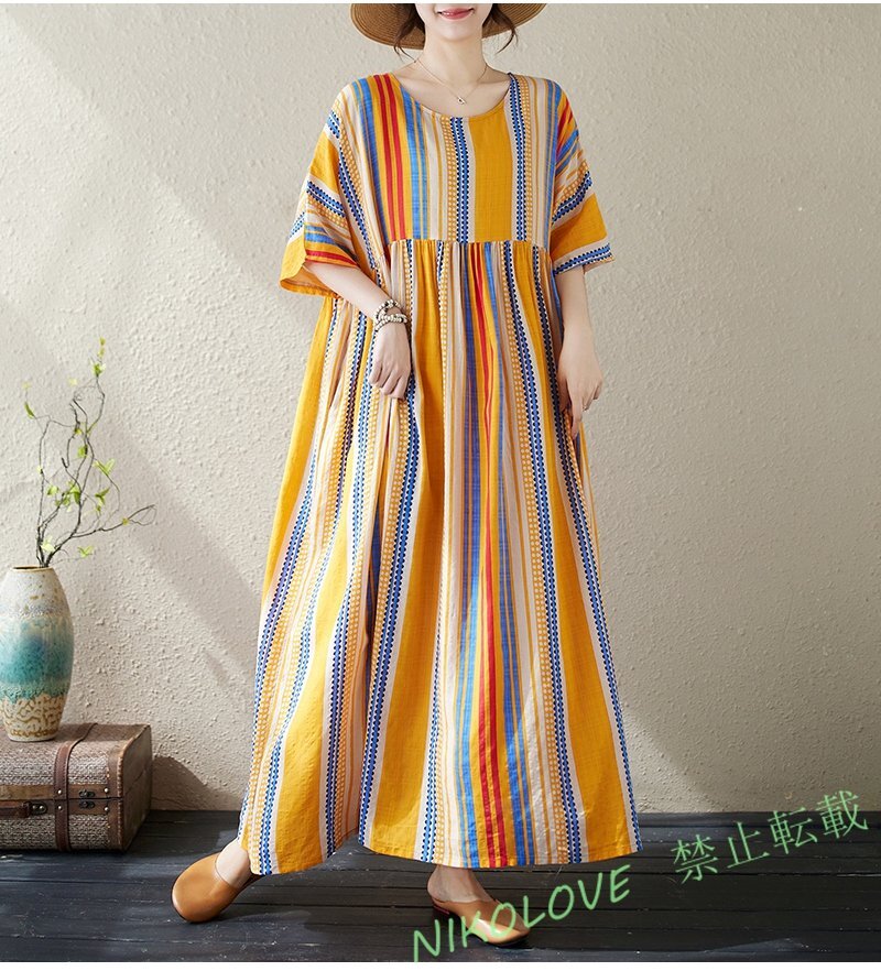 - 新品カジュアル オシャレ ゆったり大きいサイズ 体型カバー ボーダー柄 半袖ロングワンピース イエロー LE543