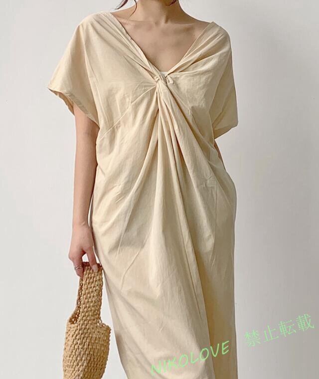 - 新品レディース ゆったり大きいサイズ カジュアル体型カバー 無地 Vネック 2WAY半袖ロングワンピースFベージュ LE886