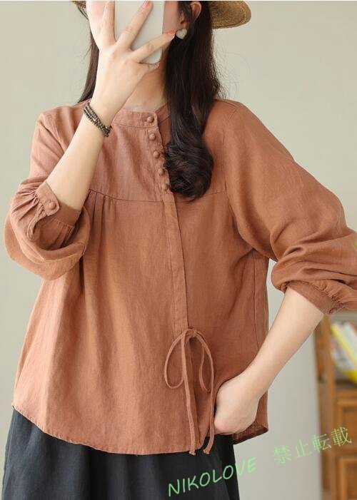 > 新品カジュアル チュニック ゆったり 無地 綿麻 着痩せ 長袖 ブラウス トップス 大きいサイズ きれいめ カラメル M-2XL LE879