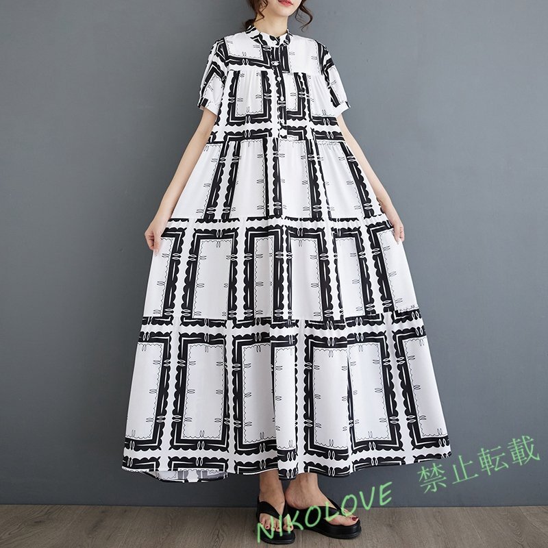 - 新品ゆったり大きいサイズ カジュアル 幾何柄 切り替え 半袖 シャツワンピース ホワイト LH446