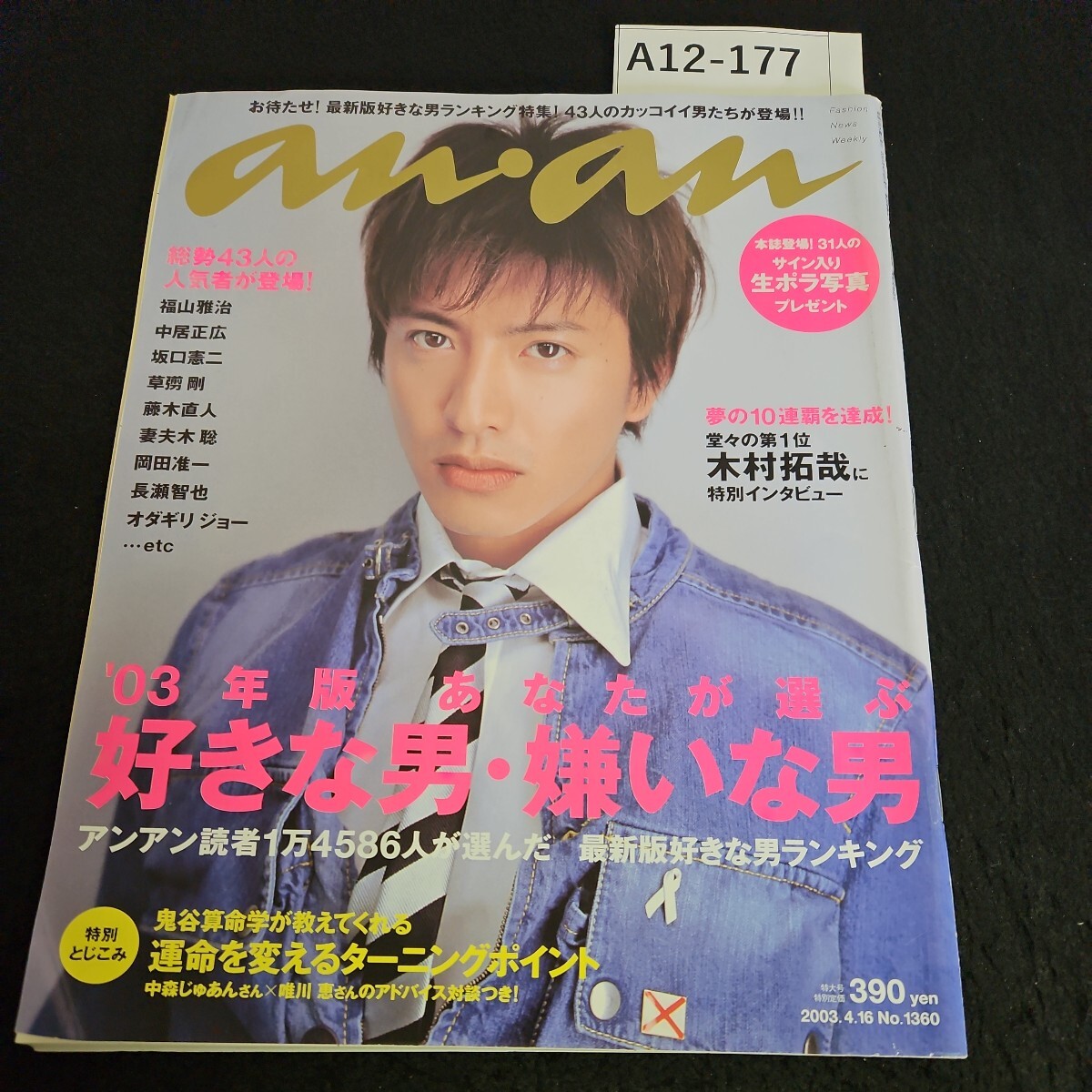 - A12-177 an an 夢の10連覇を達成 堂々の第1位 木村拓哉にインタビュー 福山雅治 中居正広 阪口憲二 草彅剛 2003年4月16日発行