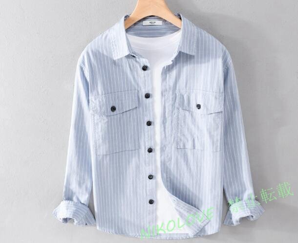 - 新品メンズシャツ 長袖シャツ ストライプ柄 ワイシャツ ヴィンテージ 心地良し ワークシャツ カジュアル 三色選択 ライトブルーXL LF484