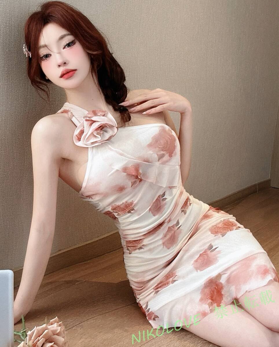 > ☆新品*良質*とろみ素材*バラ*ブローチ*付*バラ柄*花柄*オフショル*肩開き*ギャザー*入*フリル*仕様*タイト*ワンピース*LF677