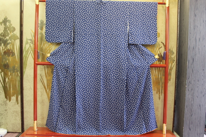 > きもの今昔7185 小紋のきもの 正絹一越地、広衿袷手縫仕立 ほぼ画像の色です 紺色地小鳥図案柄 身丈154㎝